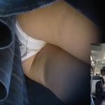 電車内でスマホに夢中で油断しているお団子ヘアのJKの純白パンティを逆さ撮り